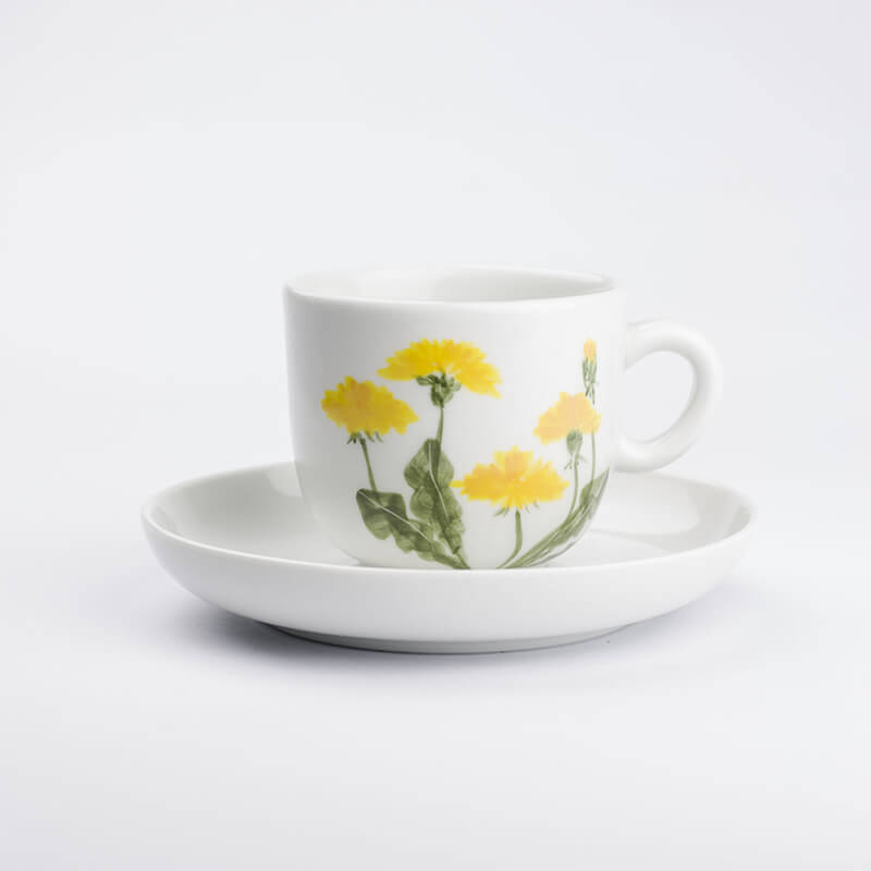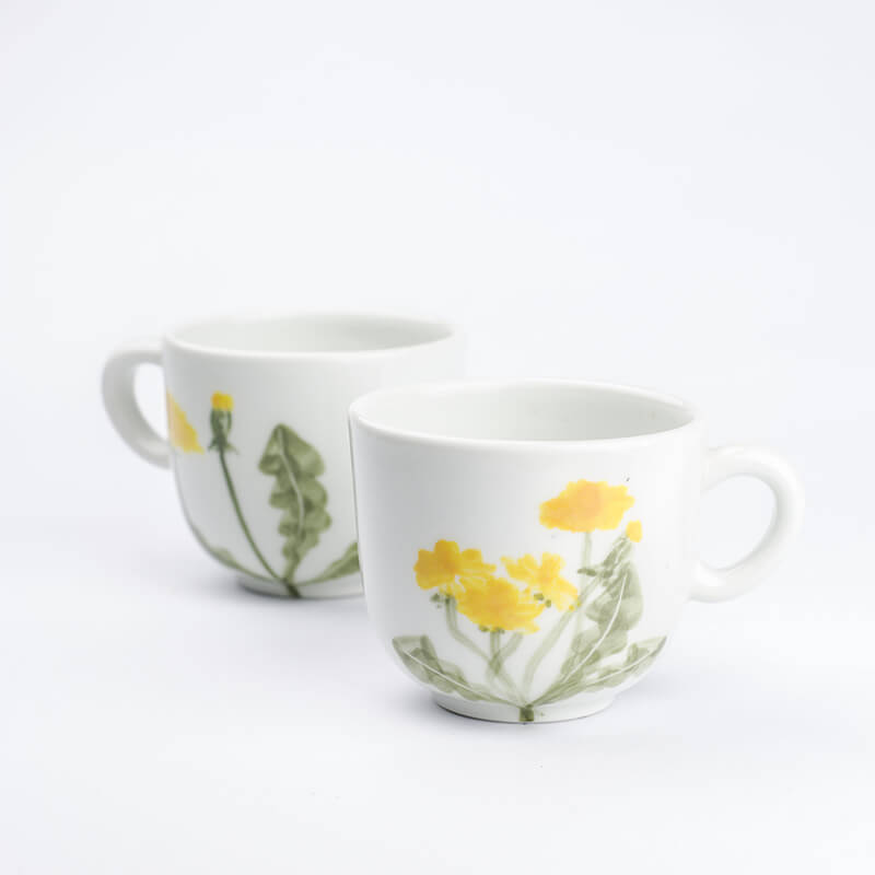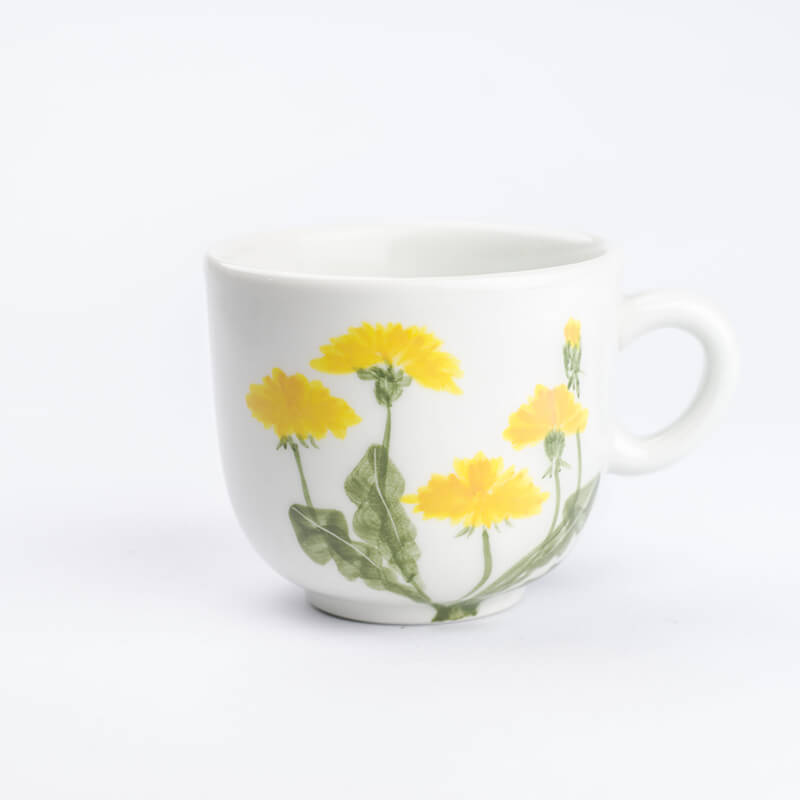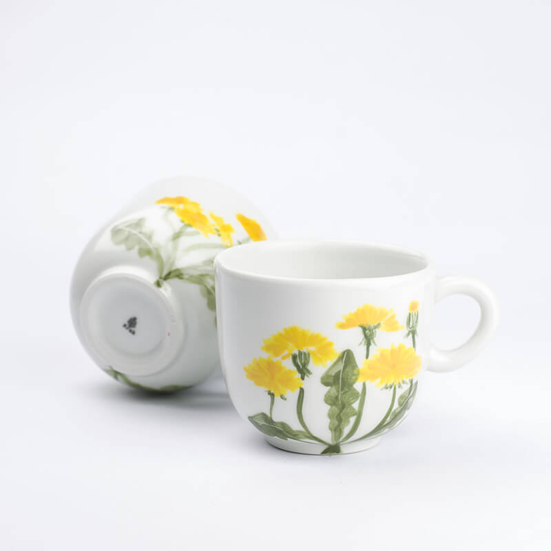 Porcelánový hrnek s originální ruční malbou. Pampeliška, taktéž smetanka lékařská neodmyslitelně patří do naši krajiny, a zahrad. Vedle asijských motivu se vracíme domů a hledáme rostliny blízké našemu prostředí. Autorem tohoto motivu je Martina.